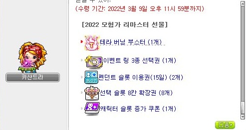 | [메이플스토리] 2022년 DESTINY Live Talk 선물 증정 / 데스티니 라이브 토크 선물 증정 (5) | 2022.01.10 |