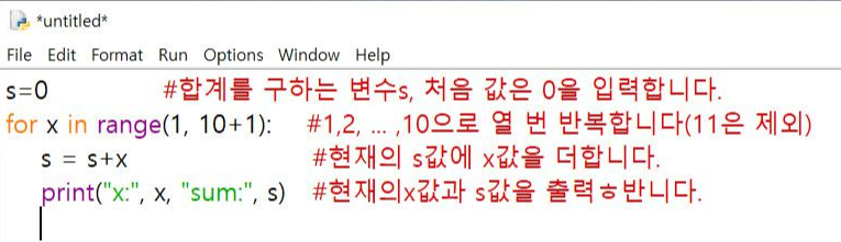 for x in range 반복구문을 쓰고 1부터 10까지의 합을 구하기 위해 범위를 1부터 11까지 잡아준다.
