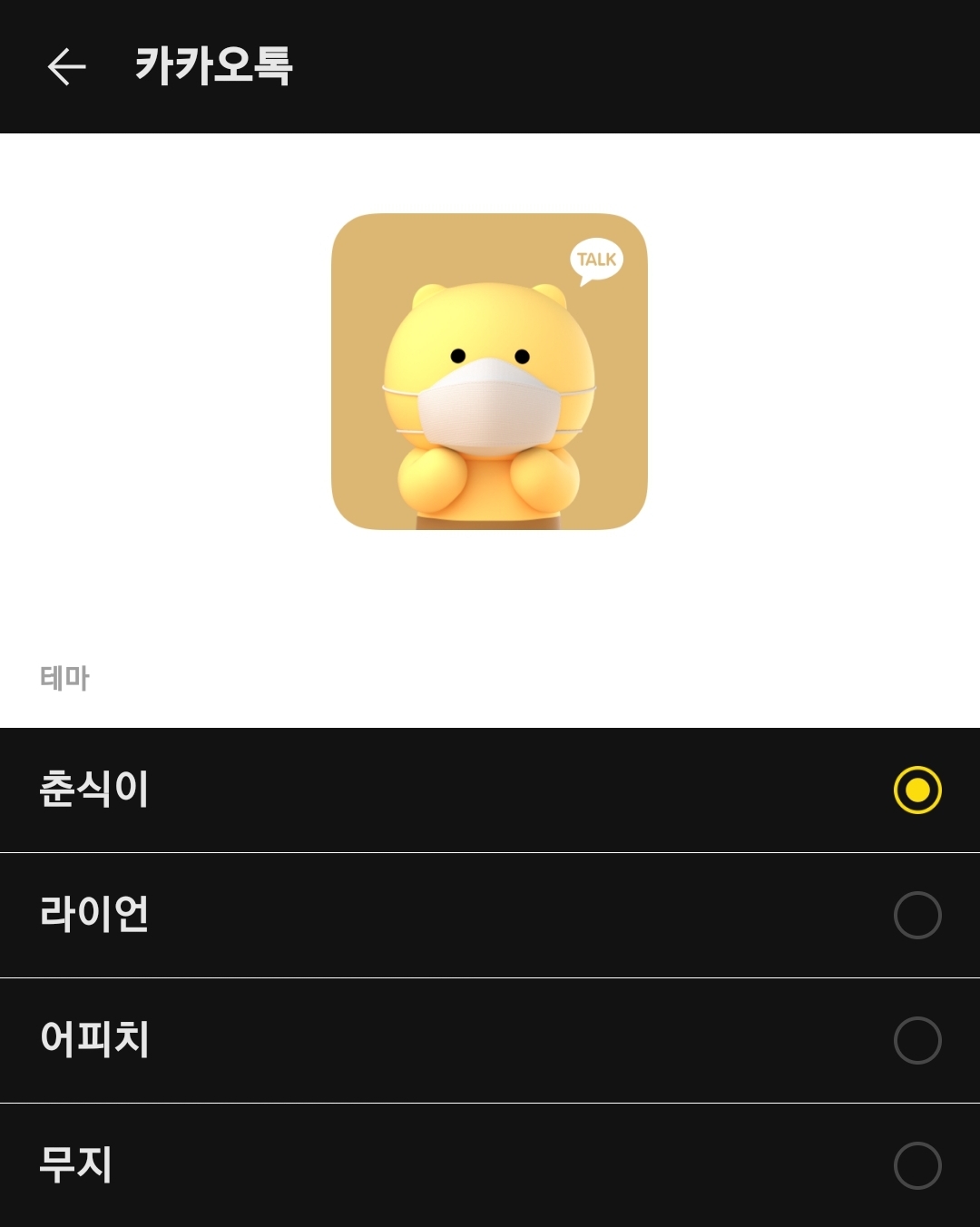 (춘식이, 라이언, 어피치, 무지)'로 변경할 수 있게
