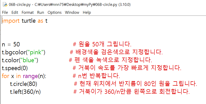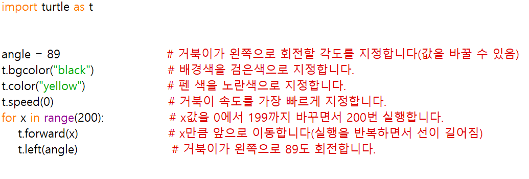 핵심 알맹이는 for ~ t.left(360/n)이고 나머지는 곁떨이들이다.