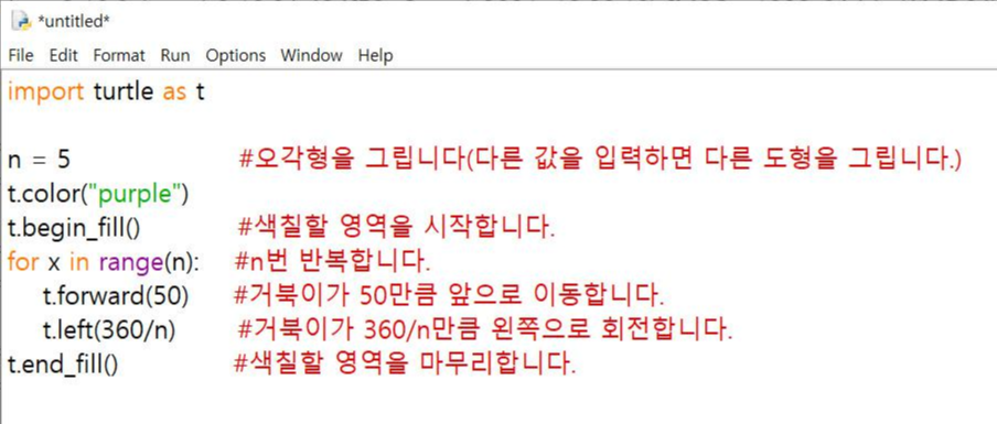 '72도'씩 방향을 튼다. 그걸 5번 반복하면 오각형이 완성되고 't.begin_fill()'과 "t.end_fill()'때문에