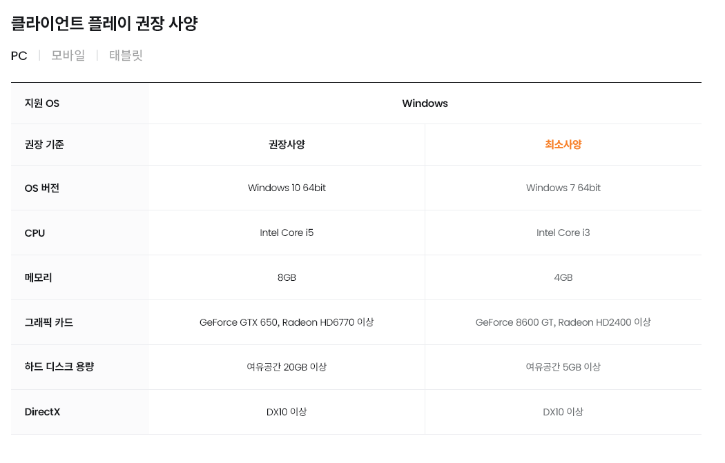 다운로드 해야한다. 권장 사양은 위 사진을 참고하길 바란다.