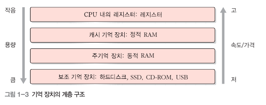 레지스터 < 캐시 < 주기억 < 보조 기억