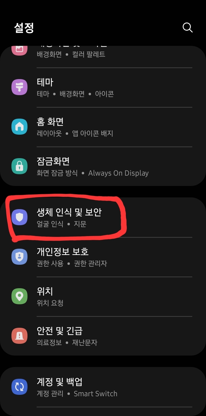 설정의 '생체 인식 및 보안'으로 들어간다.