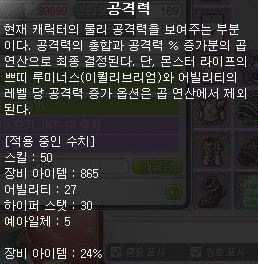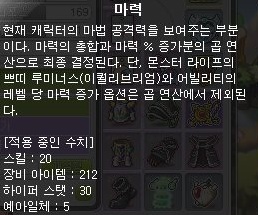 · 공격력과 마력은 현재 캐릭터의 공격력/마력 총합에 공격력/마력 % 증가 효과를 곱하여 결정됩니다. 단, 몬스터 라이프 쁘띠 루미너스(이퀄리브리엄)의 잠재능력과 어빌리티의 ‘레벨 당 공격력/마력 증가 옵션’은 공격력/마력 % 증가 효과가 적용되지 않습니다.