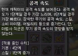 · 캐릭터의 공격 속도는 현재 장착한 무기의 공격 속도 기준으로 스킬, 소비 아이템 등의 효과가 적용된 수치를 보여줍니다. 단, 마법사 직업군은 무기 공격 속도의 영향을 받지 않습니다.