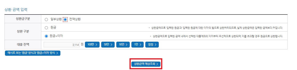 전액상환을 체크하고 상환금액 예상조회를 누르면
