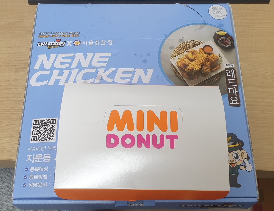 네네치킨 후라이드+양념 반반 1마리랑 미니도넛 세트를 구입!