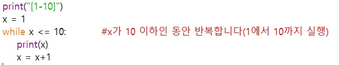 그리고 또 'while x<=10:'으로 x가 '10이하인 동안'을 나타내는 반복문 생성