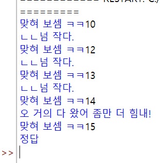 크다,작다 만 나오는게 좀 단조로워서 정답에 근접했을 때(오차범위 -+1) 거의 다왔다는 맨트를 출력 해보고 싶었다.