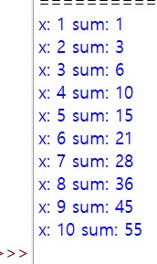그리 하여 x=10까지 반복을 하고 합이 55가 뜬 후 마무리된다.