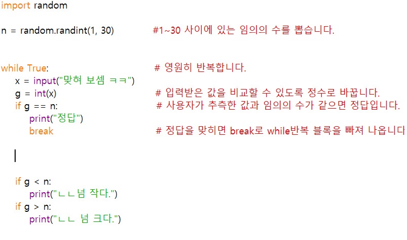 그리고 변수 n을 선언 후 'random.randint(1,30)' 1~30 사이에 있는 임의의 수를 뽑는다.