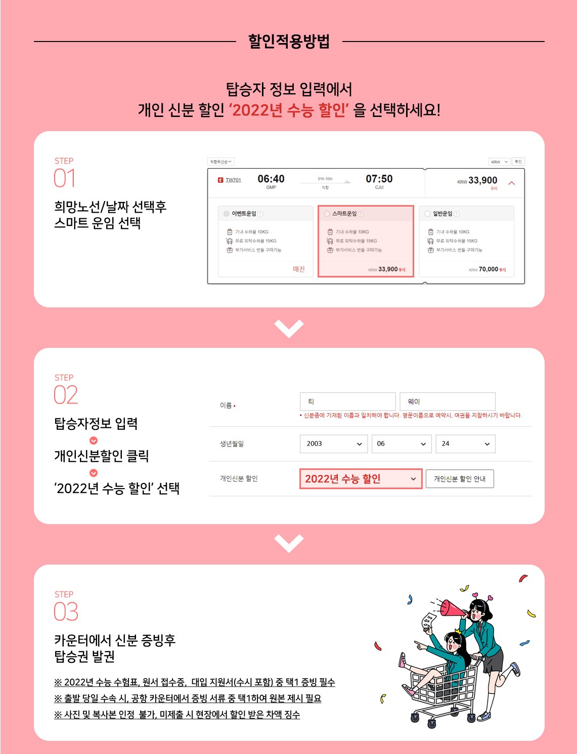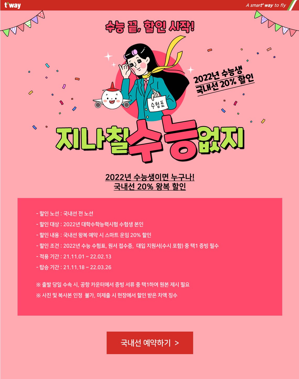- 일부 항공편에서 수능 할인 적용 시보다 낮은 탄력적 할인 운임으로 판매되는 경우가 발생할 수 있으니 참고바랍니다.