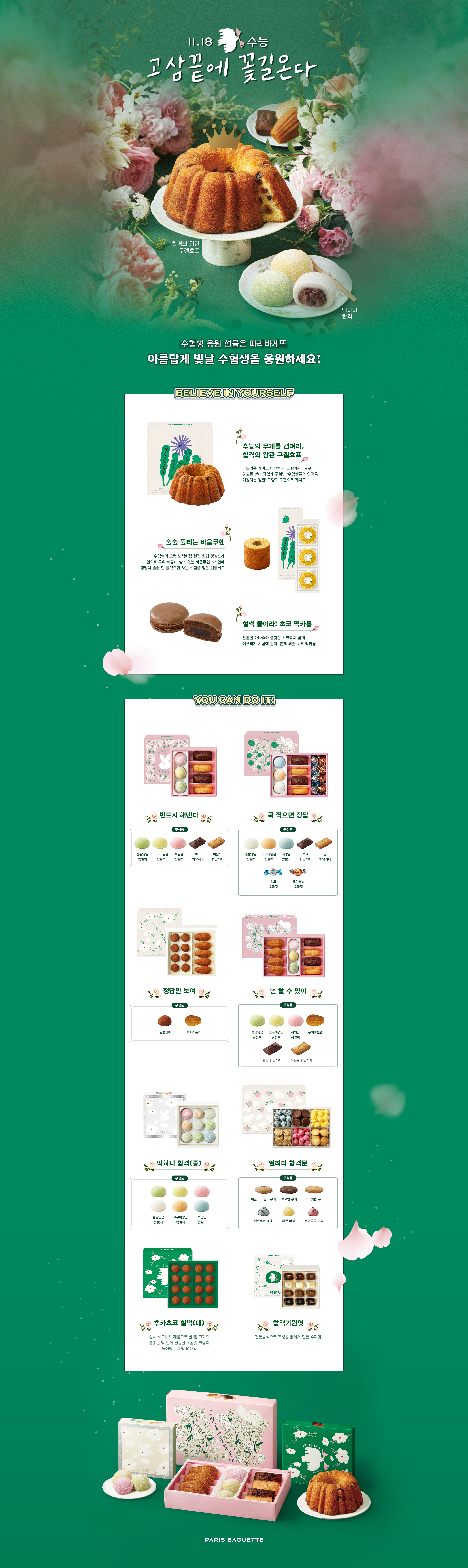 CJ푸드빌이 운영하는 뚜레쥬르는 수험생에게 응원의 메시지를 전하는 제품을 출시했다. 올해는 ‘뚜레쥬르 합격의 전당’을 콘셉트로 감동이 담긴 합격 선물을 선보인다. 세계적으로 유명한 명화를 재해석해 합격 문구를 담은 일러스트 패키지로 어느 때보다 힘든 시기를 견뎌낸 수험생들에게 긍정의 메시지를 전하고자 했다. 찹쌀떡·엿 등 전통 선물과 쿠키·초콜릿 등 양과 조합을 1만~2만 원대 가격으로 구성했다.