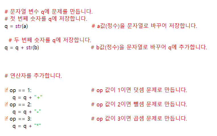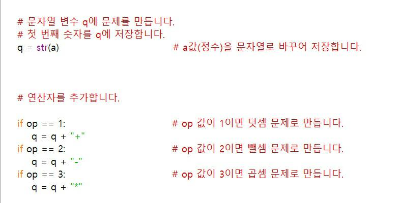 그리고 이제 문제를 낼것인데, op가 1이면 덧셈, 2이면 뺄셈, 3이면 곱셈