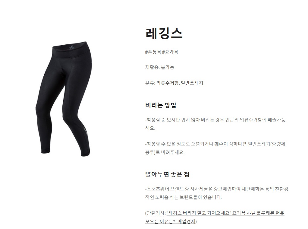 레깅스를 클릭했더니 '재활용 가능 여부', '분류', '버리는 방법', '알아두면 좋은 점' 등