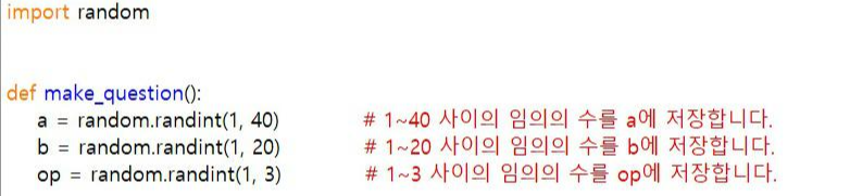 그리고 조건 반복문 'while'을 이용해 5개까지 문제를 출제하도록 설정한다.