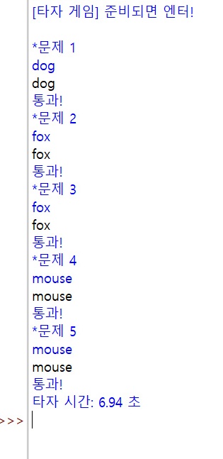 'print(q)'를 입력해준다. 그리고 유저가 입력한 단어와 제시된 단어의