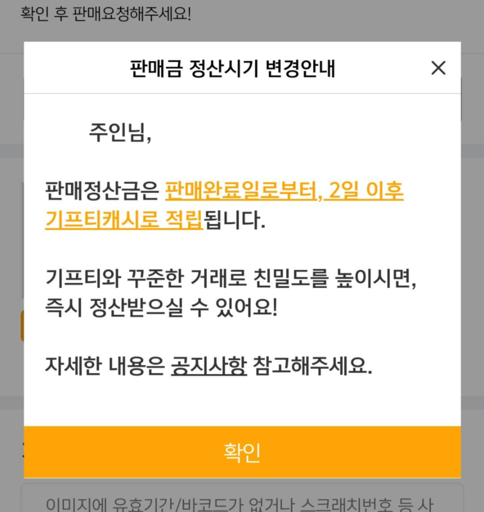 그리고 판매된 금액은 '기프티캐시'로 입금되므로 기프티캐시 내역에서 확인 가능합니다.