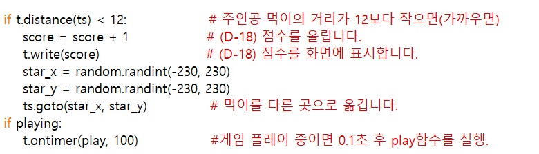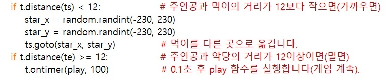 그리고 플레이어와 빨간 거북이 사이의 거리가 12 미만이면