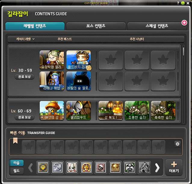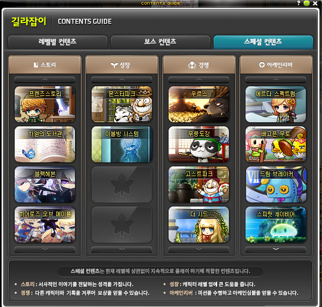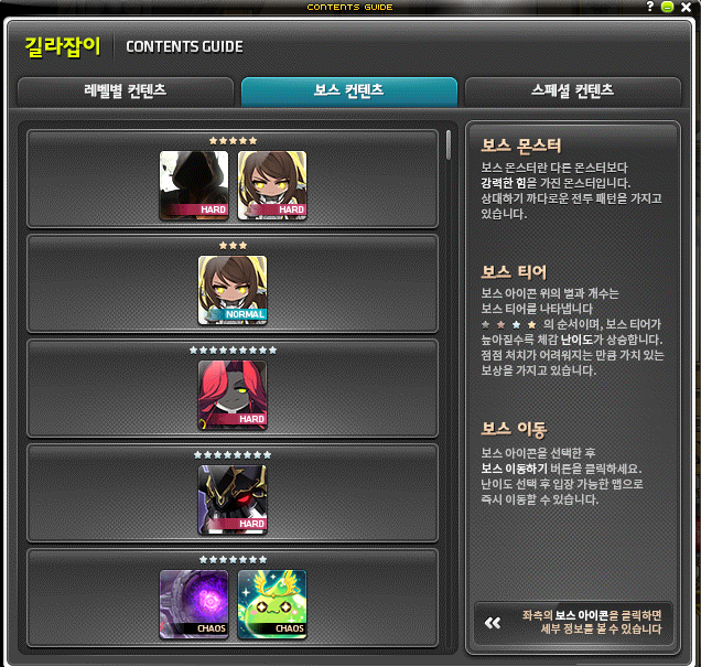 '레벨별 콘텐츠', '보스 콘텐츠', '스페셜 콘텐츠'로